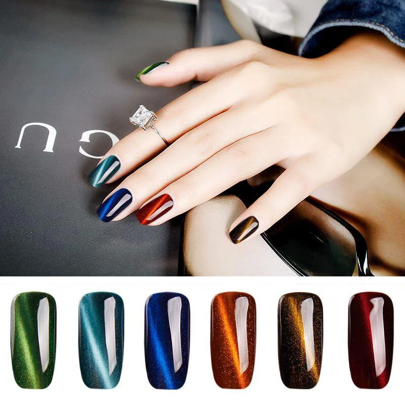 - Гель-лаки с эффектом кошачьего глаза обычно очень плотные, однако для максимально красивого эффекта лучше всего наносить гель-лак поочередно, и каждый ноготь сушить в лампе по-отдельности после создания эффекта магнитом.