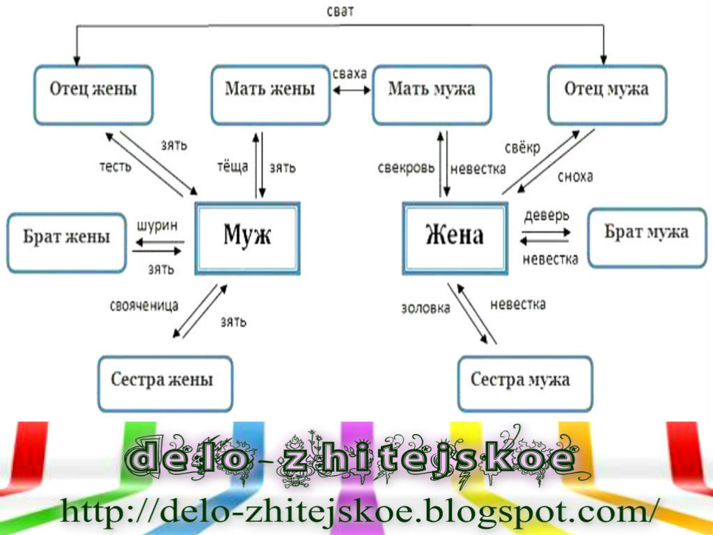 Родственные связиКогда мы женимся или выходим замуж родственников у нас сразу становится в два раза больше. И все как-то называются. Сразу и не запомнишь. Нет, ну тещу-то ни с кем не спутаешь! А вот с остальными мы сейчас и разберемся…