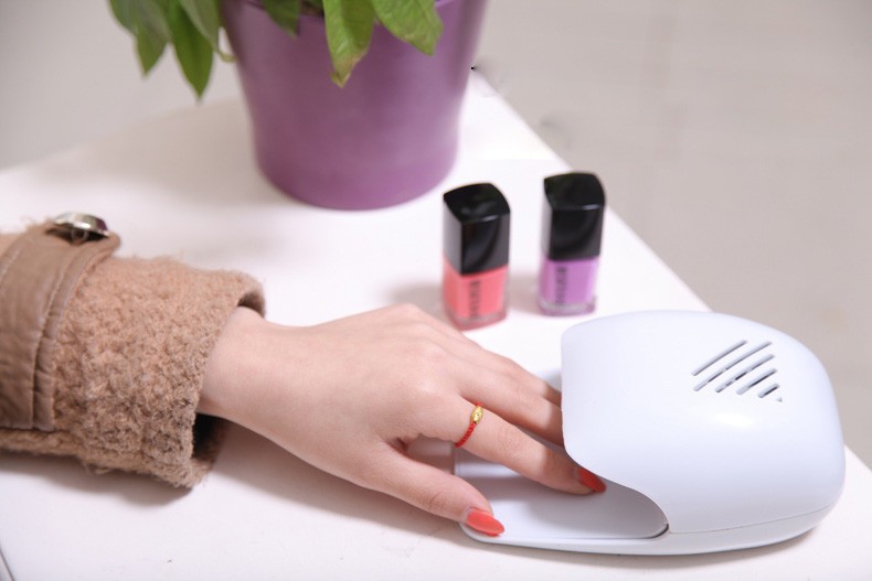 Существует маникюрный вентилятор — это профессиональное приспособление можно купить в специальных магазинах, и стоит оно совсем недорого. Маникюрный вентилятор обладает специальным отверстием, куда надо класть пальцы для просушки. Имеется приспособление для одной руки и для двух рук. При помощи этого приспособления разрешено просушивать несветочувствительные покрытия.
