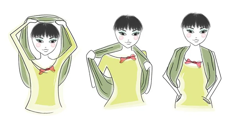 Просто продень руки в шарф — так, будто ты надеваешь жилетку. Три секунды, и романтический образ создан!