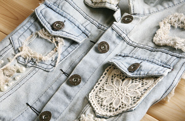 Кружевная отделка поможет обновить старую джинсовую куртку. Такой декор отлично скрывает изношенную ткань. Материалы стильно смотрятся, придают образу женственности. Кружевом можно украсить воротник, манжеты. Белое и черное кружево отлично подойдет к синей джинсовой ткани. Темные и холодные оттенки отделки – для черных курток. А яркие и сочные краски будут эффектно смотреться на белых джинсовках.