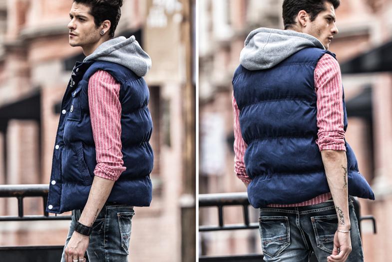 Жилет как самостоятельная одежда.Популярность стеганого мужского жилета как самостоятельного элемента мужского гардероба растет с каждым годом. Одно из главных преимуществ — легкость и удобство. Они хорошо защищают от ветра и сохраняют тепло. Второе преимущество — их с легкостью можно носить практически с любой одеждой из вашего гардероба. Пожалуй лучше начнем с того, с чем нельзя носить мужские стеганые жилеты — деловыми и классическими костюмами, классическими рубашками и туфлями. Если же вы решаетесь на такое и у вас есть лаконичный жилет классических цветов, образ должен быть продуман до мелочей, но все же в таких комбинациях мы не рекомендуем носить жилеты. Что же касается повседневной одежды, то здесь «кто на что горазд».